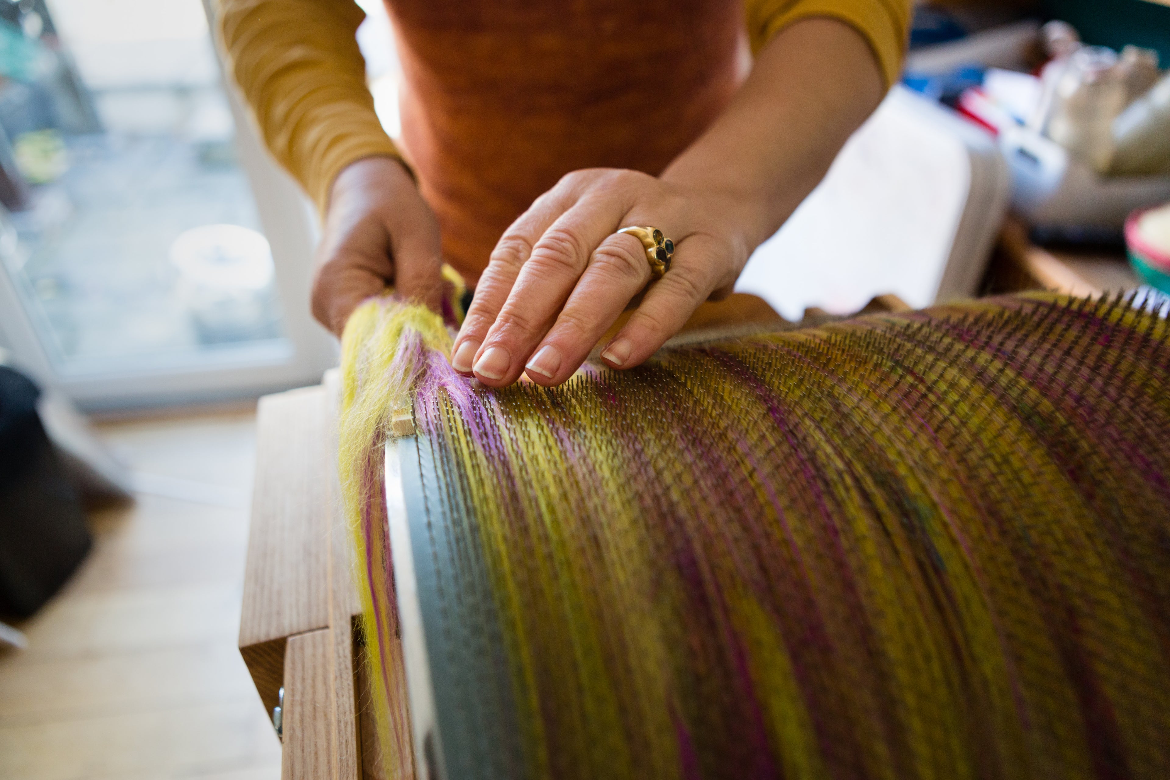 This British Kent Romney hand-dyed combed top is beautifully lustrous, and takes colour with a lovely depth. Romney is one of my favourite fibres to spin because it has loads of character. It great for spinning finely, but also makes a good woollen yarn, as it has quite an open character, so creates a lovely, lofty yarn. I find it easy to wear next to my skin.