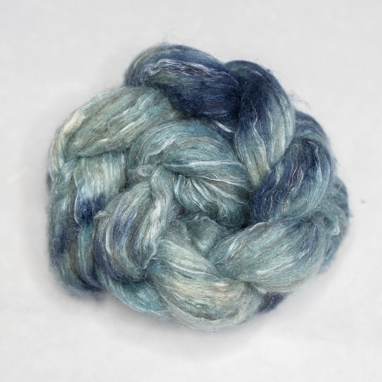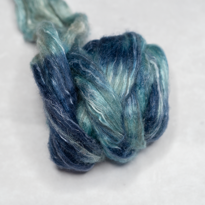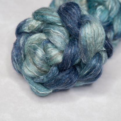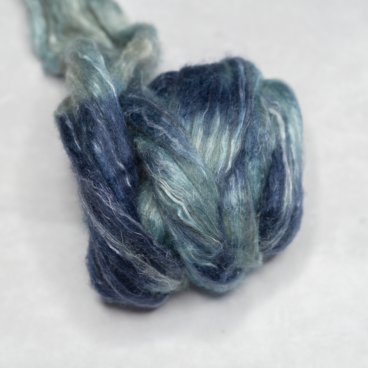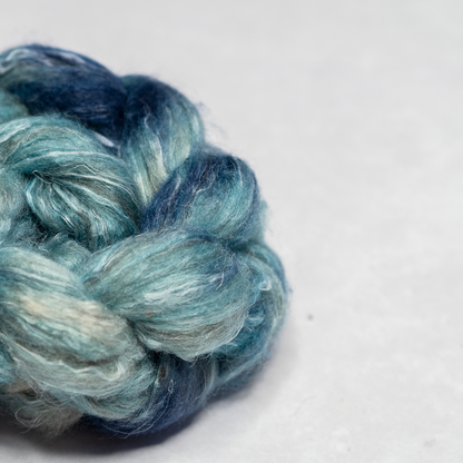 This blend is a textured mix of Bluefaced Leicester, silk and linen.  The fibres are well blended to ensure ease of drafting and even distribution of fibres.  The BFL and silk work beautifully together, giving the soft BFL sheen and drape, and the linen adds an interesting, almost paper texture to the fibre.  When spinning, the linen can feel rather stiff, but in the final yarn it adds a delicious lightness which gets softer and softer with use.  This fibre is perfect for knitting drapey garments, such as summery t-shirts, light scarves and warm-weather cardigans, but it works well for cold weather items too.