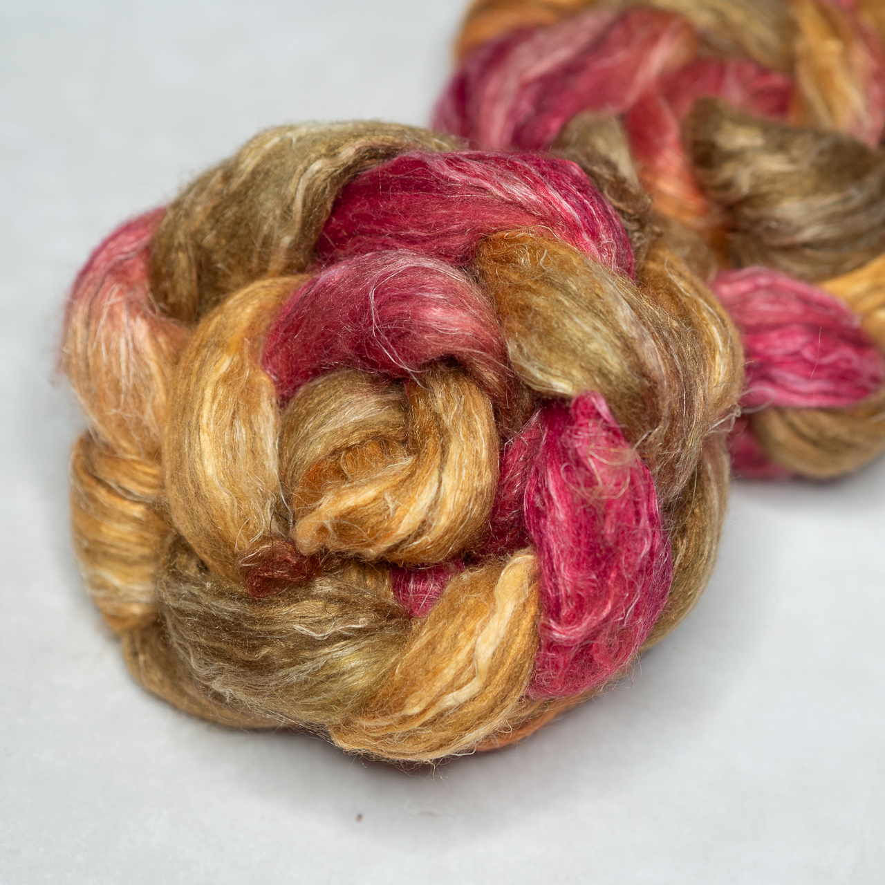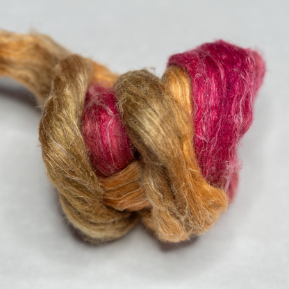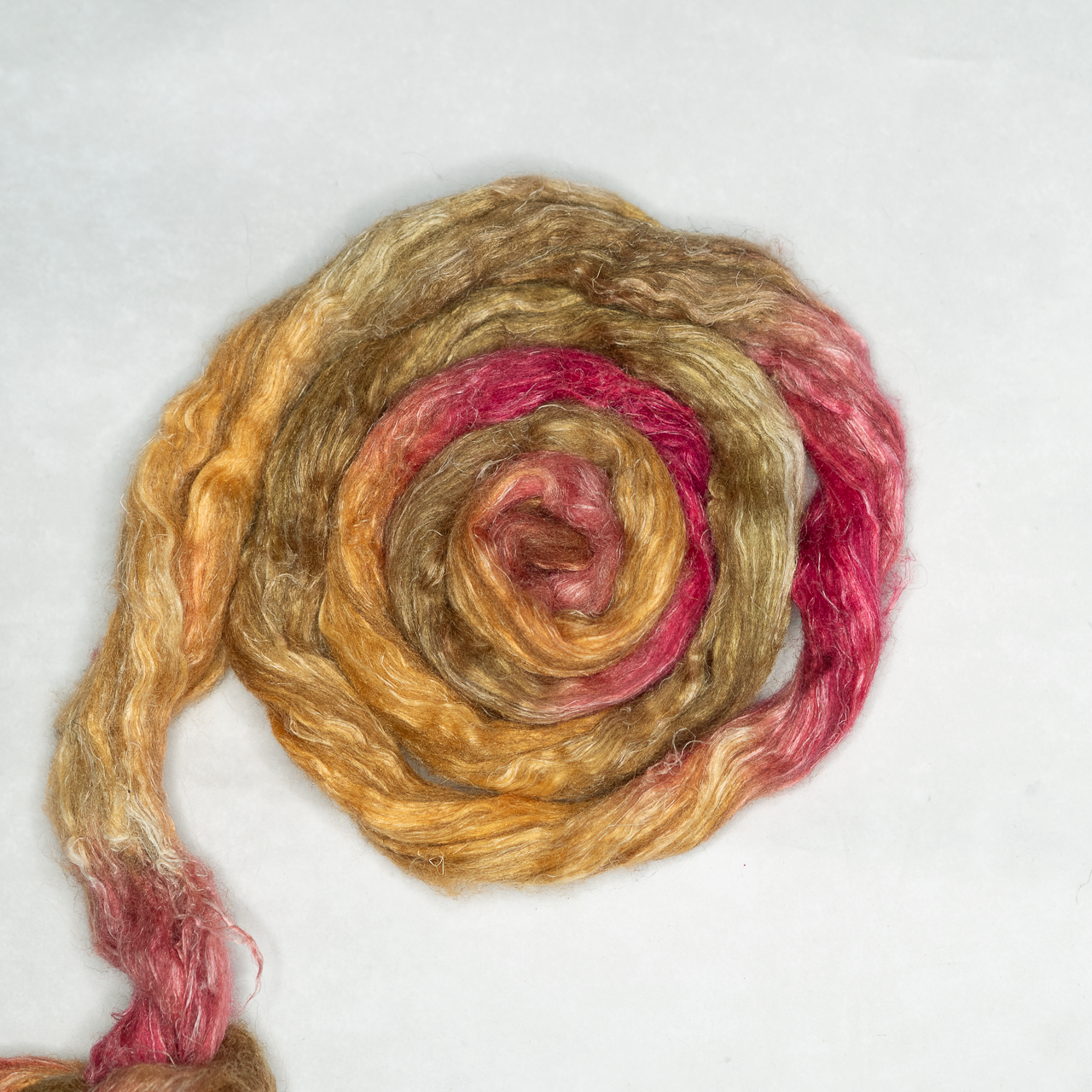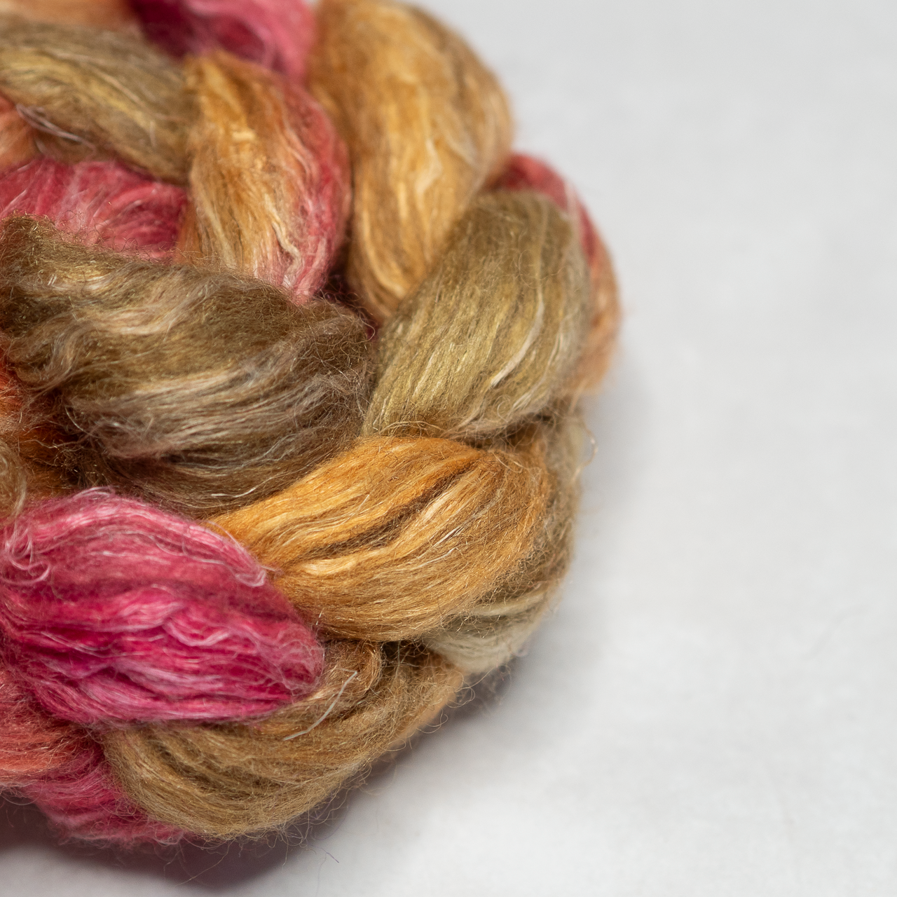This blend is a textured mix of Bluefaced Leicester, silk and linen.  The fibres are well blended to ensure ease of drafting and even distribution of fibres.  The BFL and silk work beautifully together, giving the soft BFL sheen and drape, and the linen adds an interesting, almost paper texture to the fibre.  When spinning, the linen can feel rather stiff, but in the final yarn it adds a delicious lightness which gets softer and softer with use.  This fibre is perfect for knitting drapey garments, such as summery t-shirts, light scarves and warm-weather cardigans, but it works well for cold weather items too.
