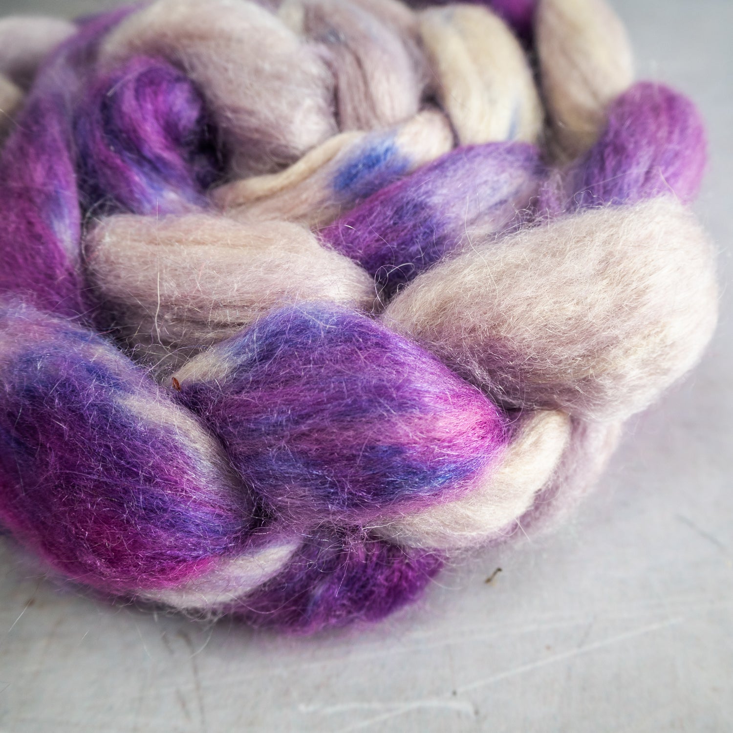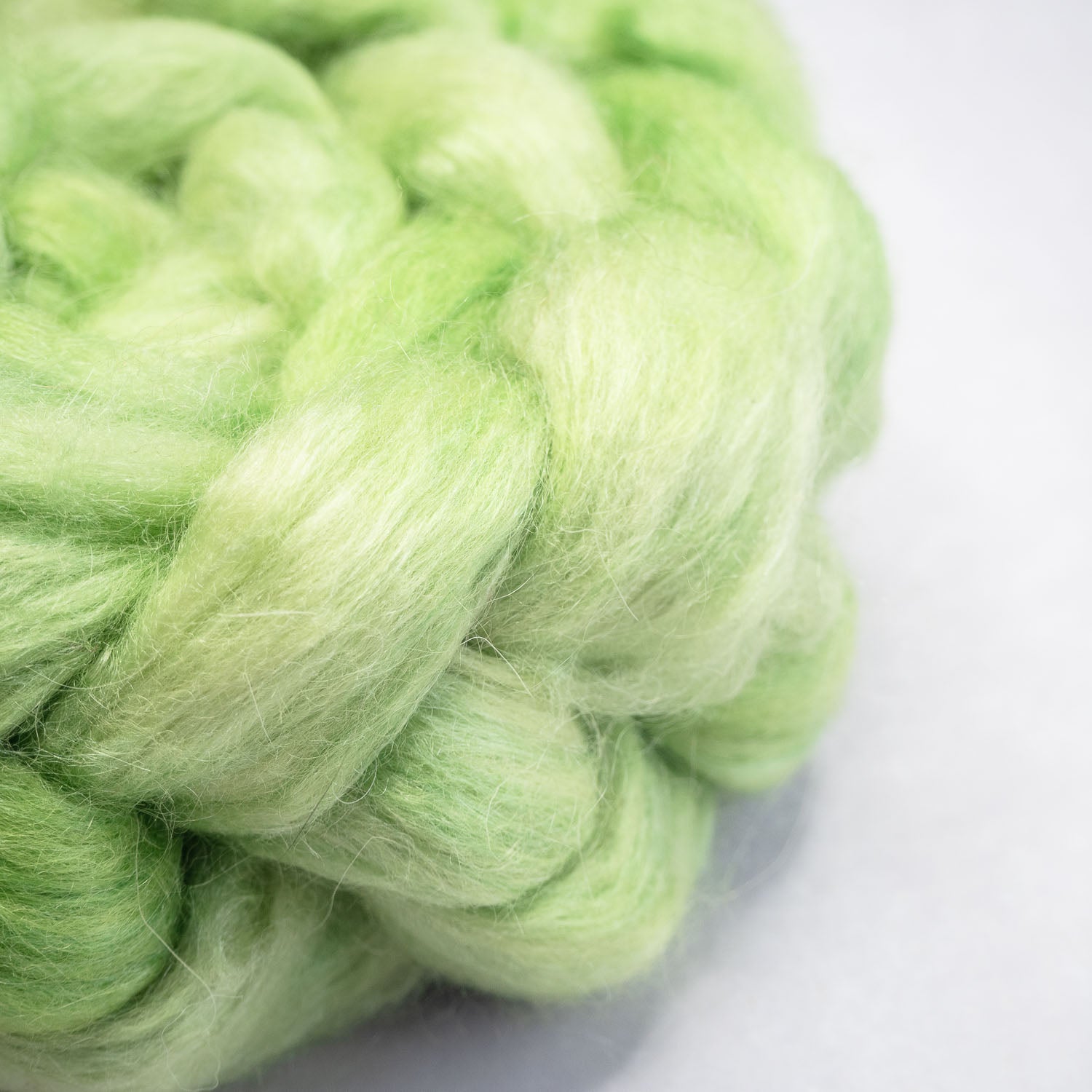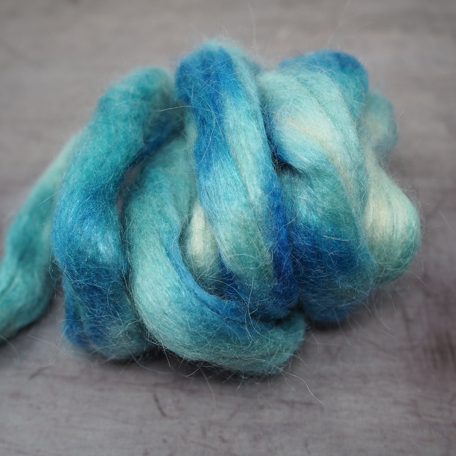 This blend of Bluefaced Leicester, silk and kid mohair fibre is superlatively soft and shiny, and the yarn will have a gentle halo when spun. How it is spun, whether it's and airy or fluffy woollen spin or a smooth worsted spin, will define the amount of halo.