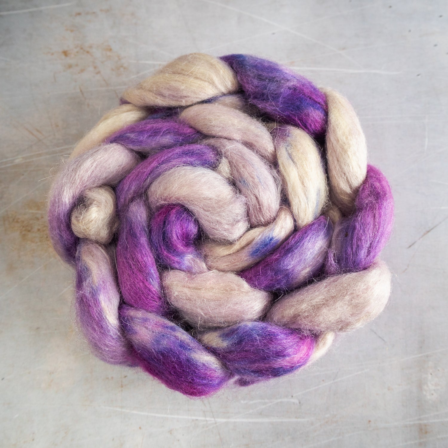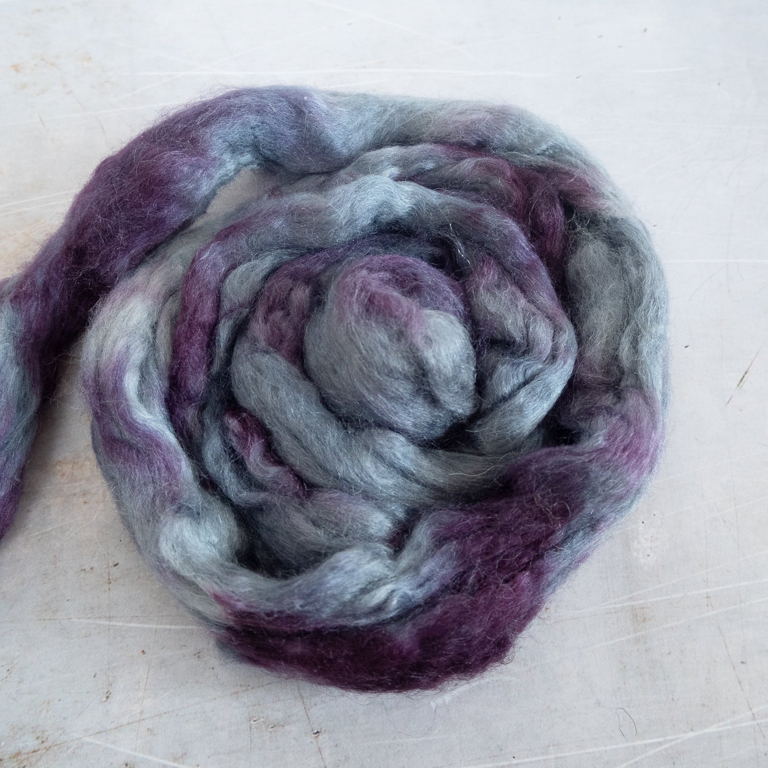 The silk adds strength, sheen and smoothness and the BFL gives loft and elasticity. This blend is a real delight to spin, and the resulting yarn is soft and warm, with lots of drape.