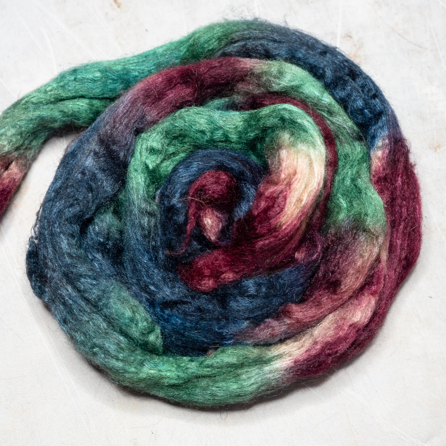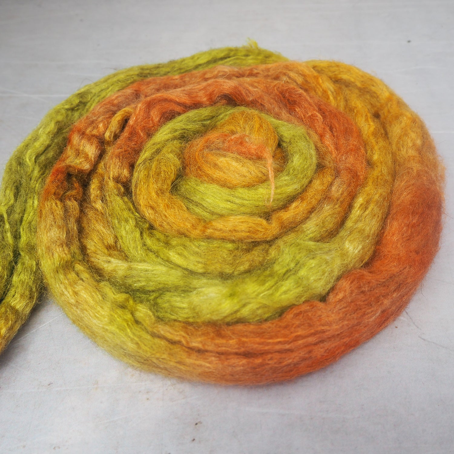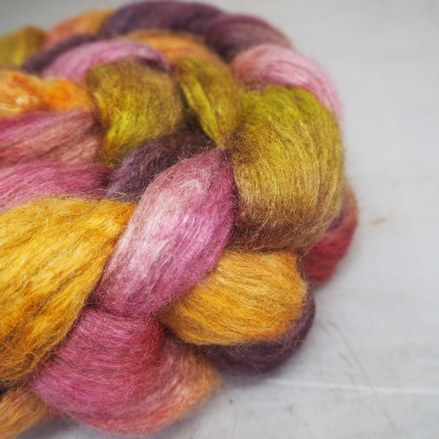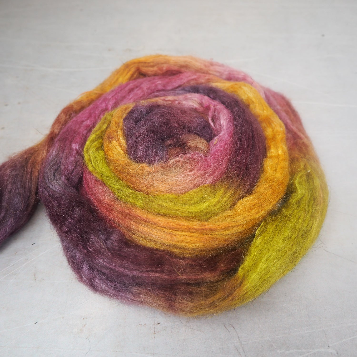 This blend of oatmeal Bluefaced Leicester and natural Tussah silk is a delight. BFL is deliciously soft and strong with a lovely character, and the silk adds luxury and drape. The oatmeal colour of the BFL and the natural, unbleached silk add depth to any colours dyed on to them. It's a dream to spin, and also felts beautifully. This two fibres are well blended, making this great for beginner spinners and seasoned spinners alike, and would be good for luxurious socks, cosy mitts or scarves to keep out wintry gusts.