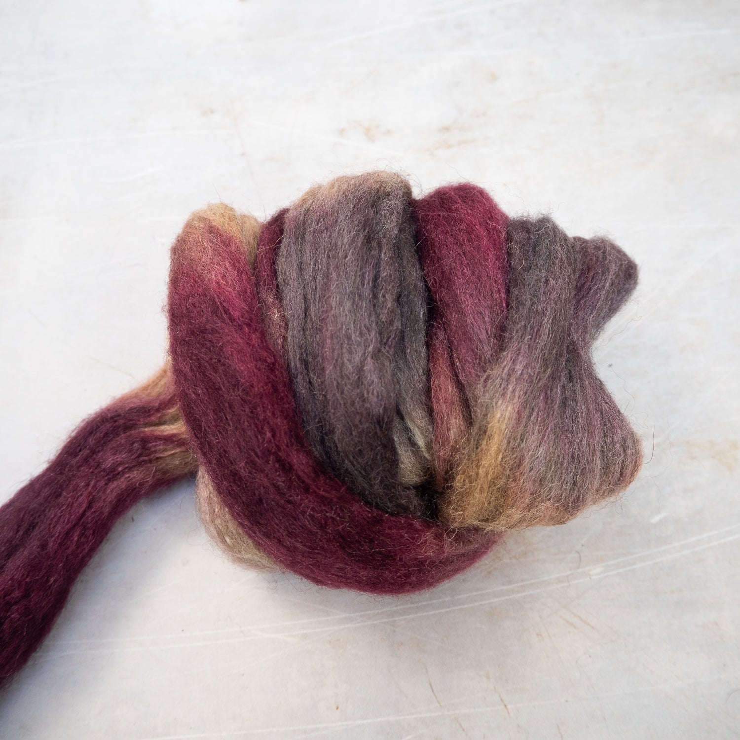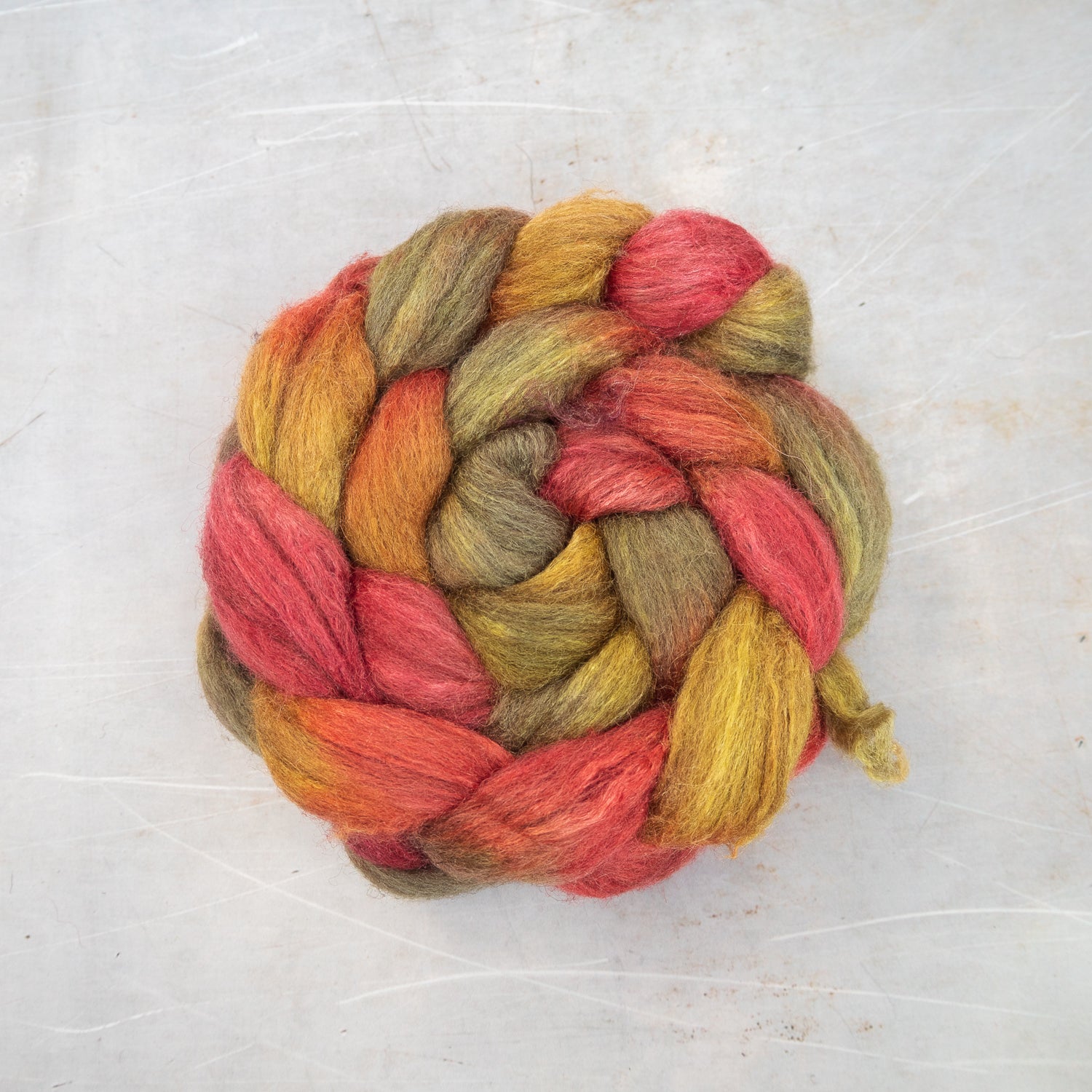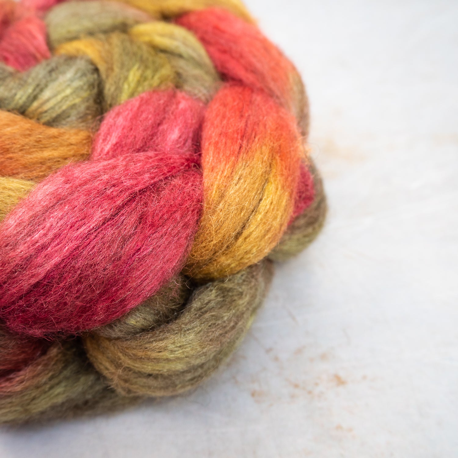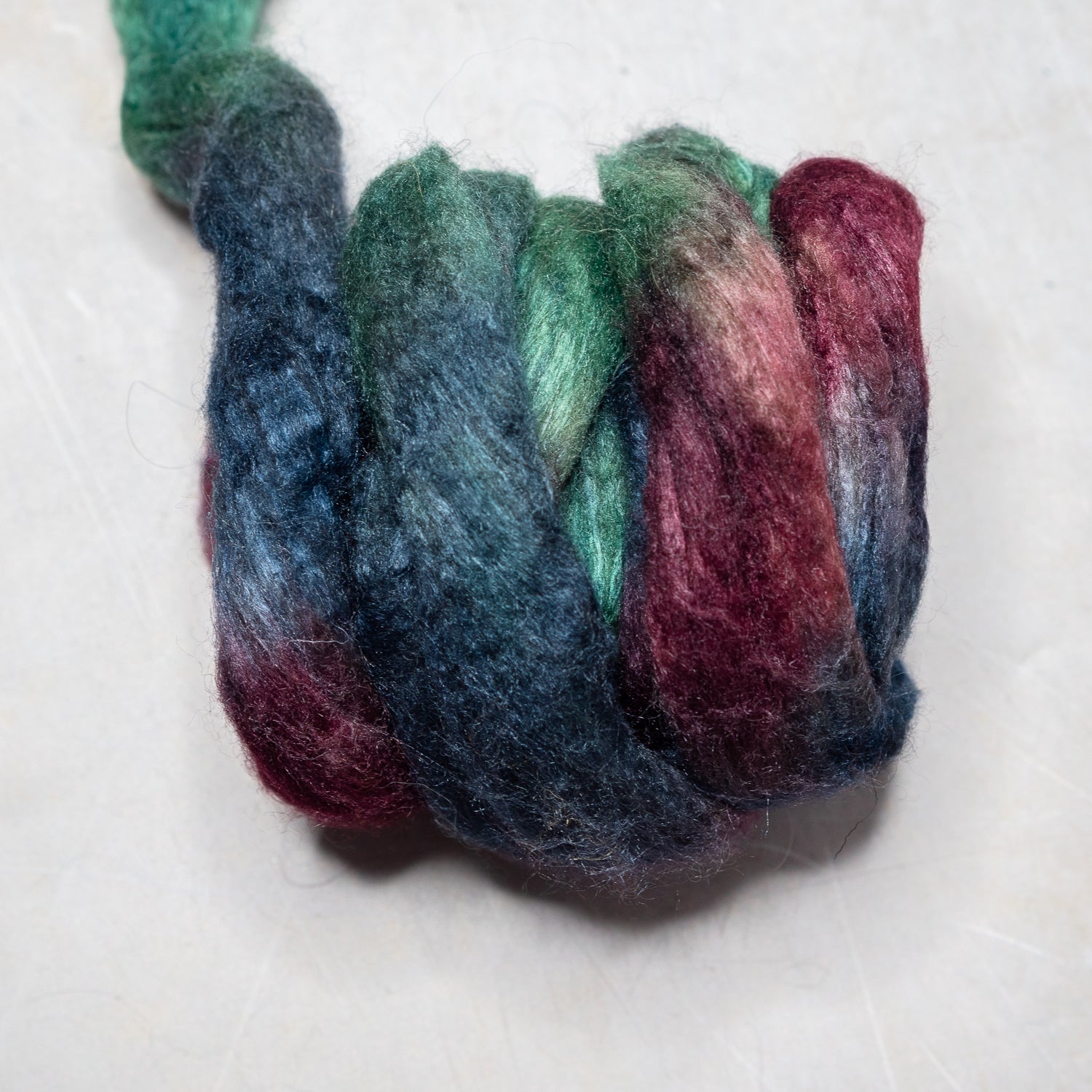 This blend of oatmeal Bluefaced Leicester and natural Tussah silk is a delight. BFL is deliciously soft and strong with a lovely character, and the silk adds luxury and drape. The oatmeal colour of the BFL and the natural, unbleached silk add depth to any colours dyed on to them. It's a dream to spin, and also felts beautifully. This two fibres are well blended, making this great for beginner spinners and seasoned spinners alike, and would be good for luxurious socks, cosy mitts or scarves to keep out wintry gusts.