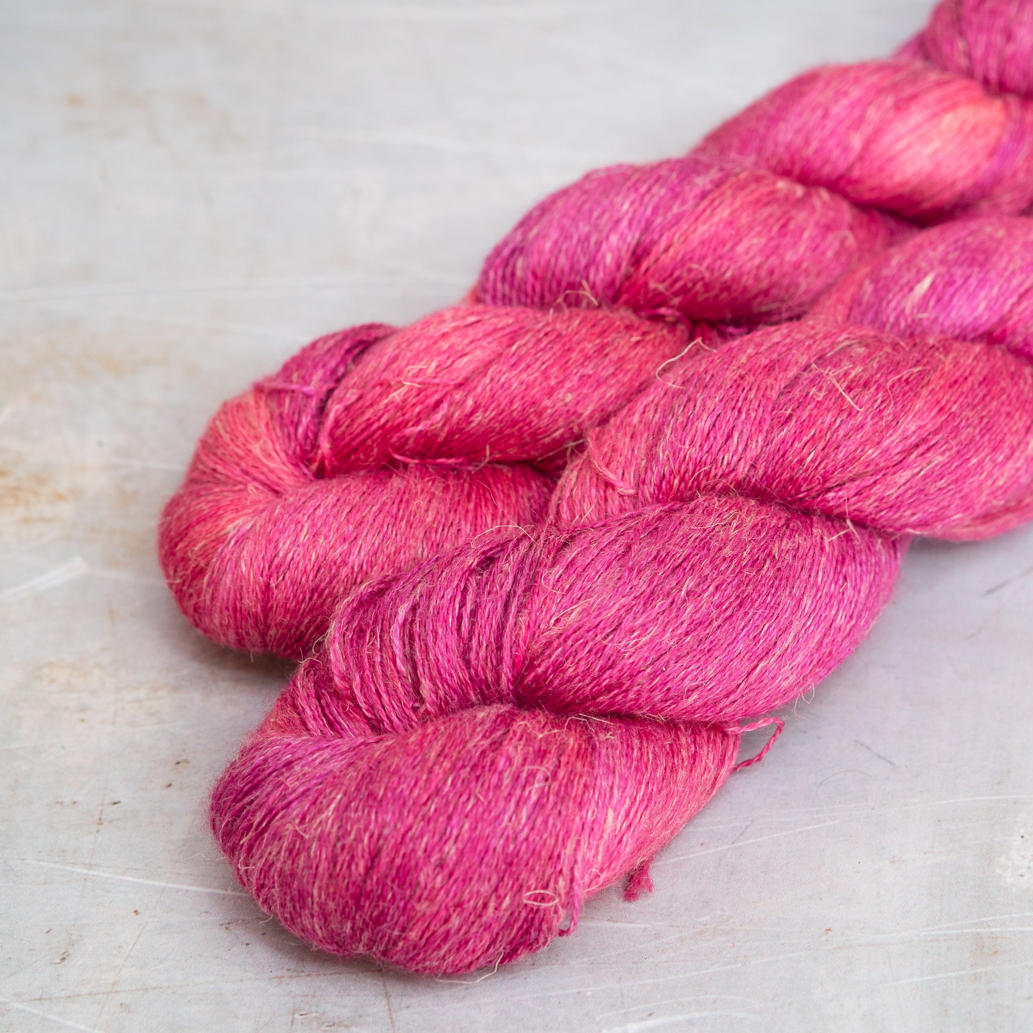 This is a beautifully delicate feeling yarn with a surprising amount of strength. The alpaca is slightly fuzzy, and lends anything made from it a lovely warmth. Silk adds drape and sheen, and linen a softness and lightness that begs to be worked into intricate lace shawls or drape summer tops.