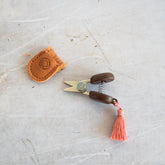 These beautiful, tiny yarn snips are exquisitely made by master cutlery makers in Seki, Japan. They're the perfect size for a notions pouch or project bag, and the leather blade protector will stop any accidental snipping.