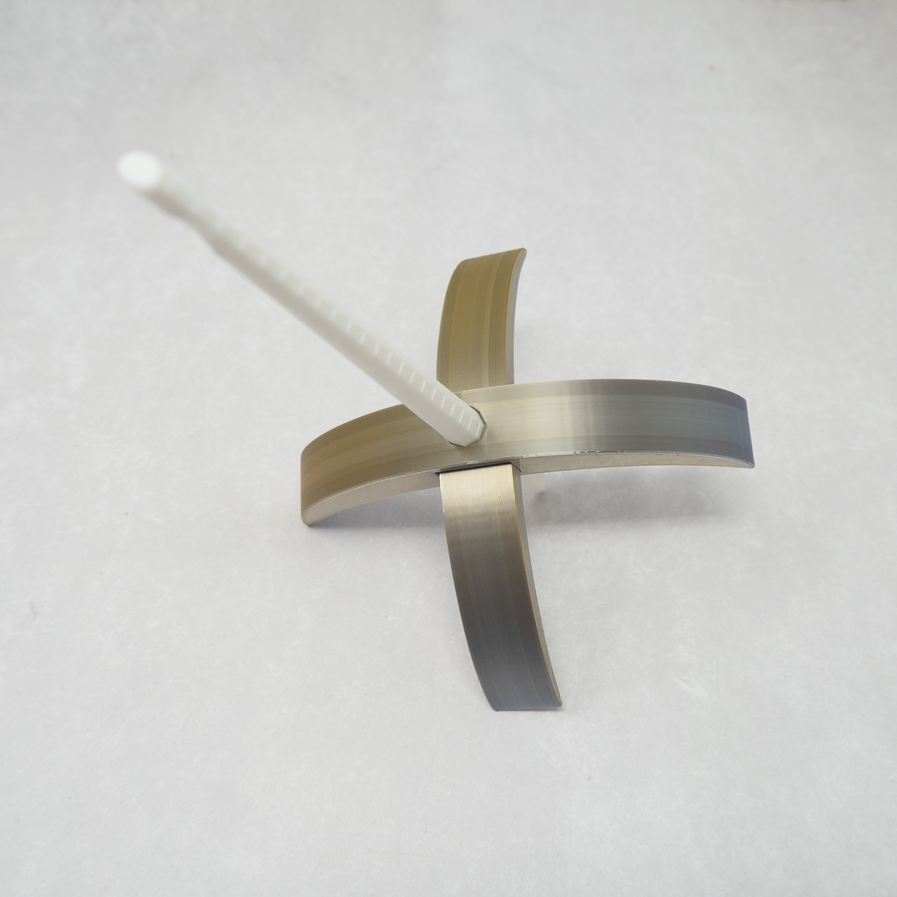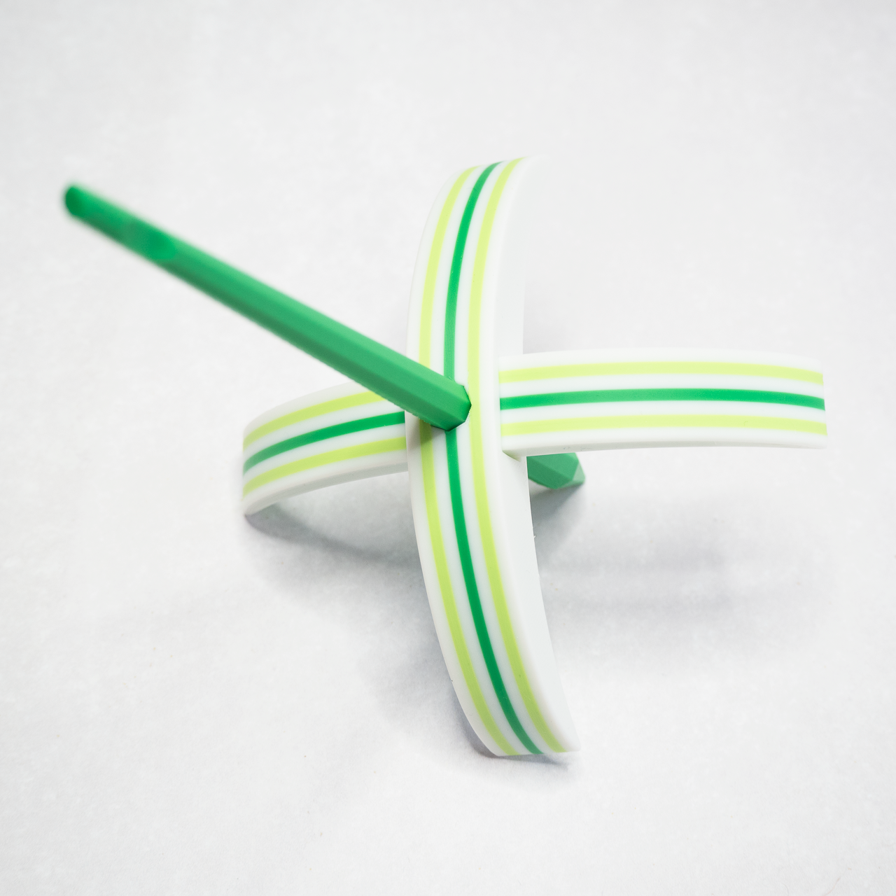 The spindle arms and shaft are made from PLA, which is a durable, biodegradable thermoplastic.