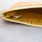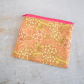 This peach cotton is scattered with leaves and meadow flowers. The lining is patterned olive cotton and zips are lemon, peach or pink.