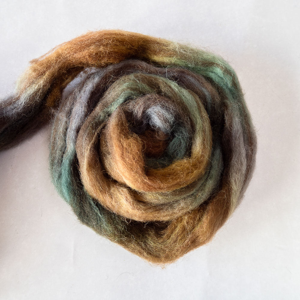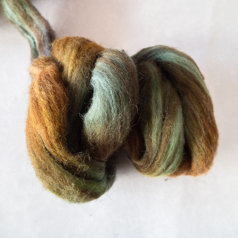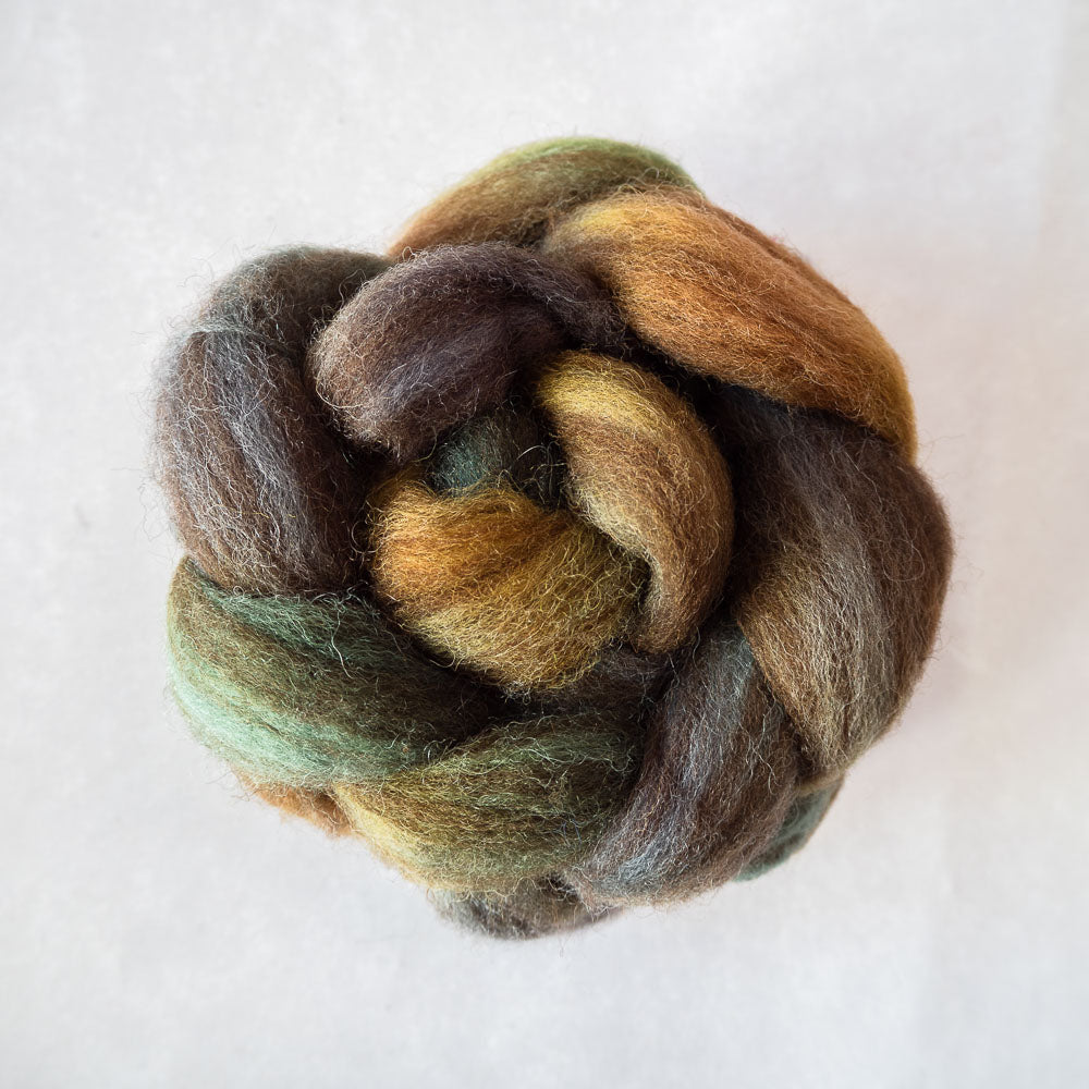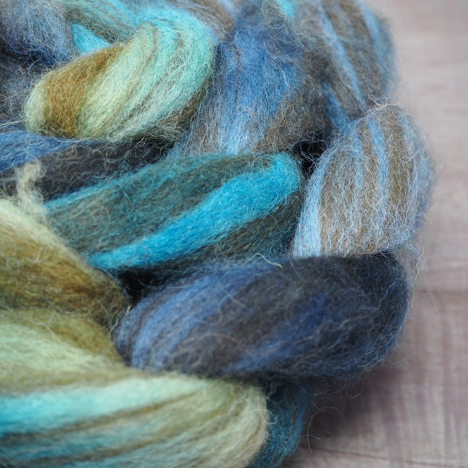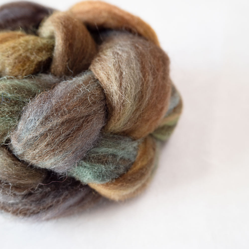 Spinning hand-dyed Shetland wool is a wonderful experience. This combed top is a humbug blend of different coloured wools, including white, grey, moorit (soft red-brown) and dark brown, giving it fantastic depth of colour.
