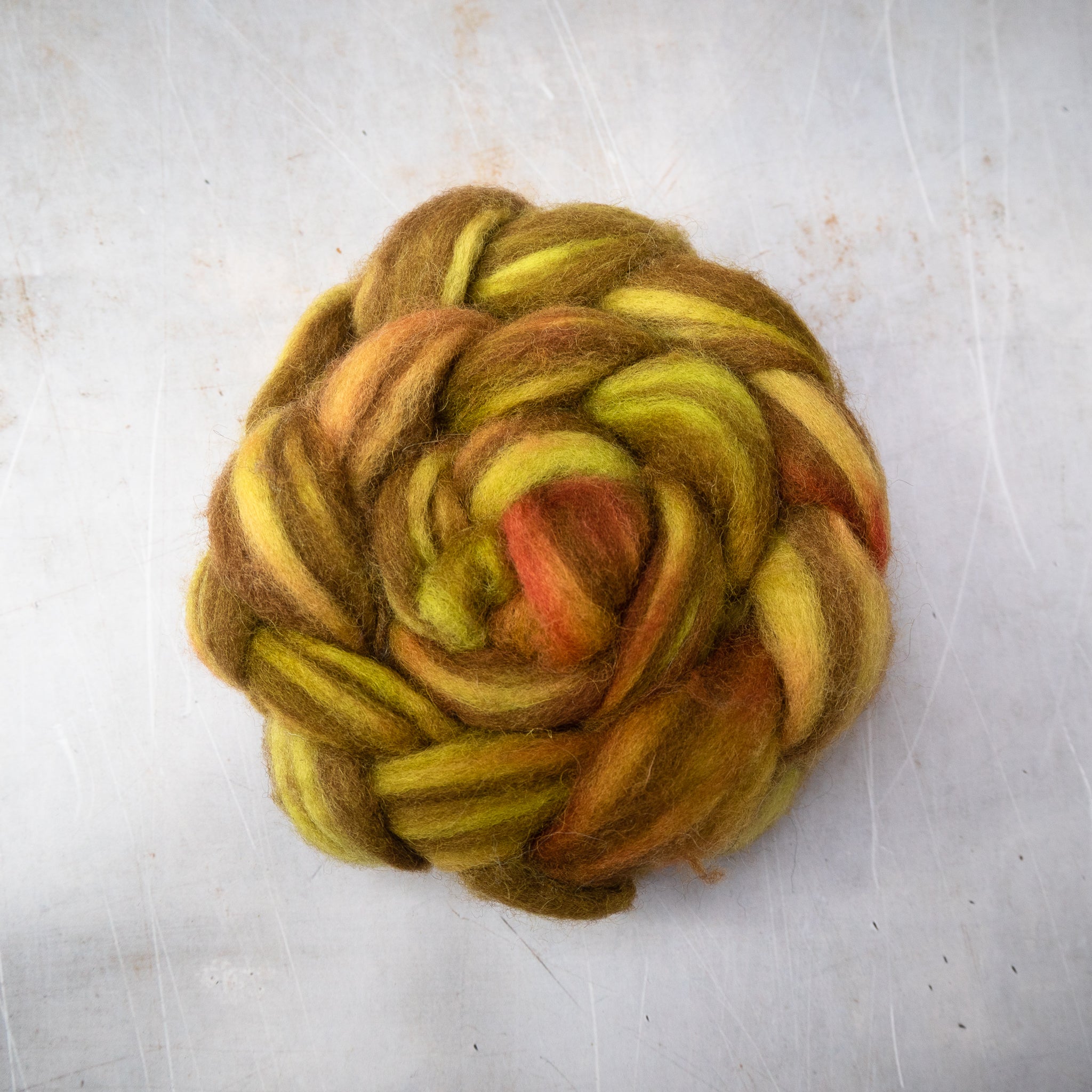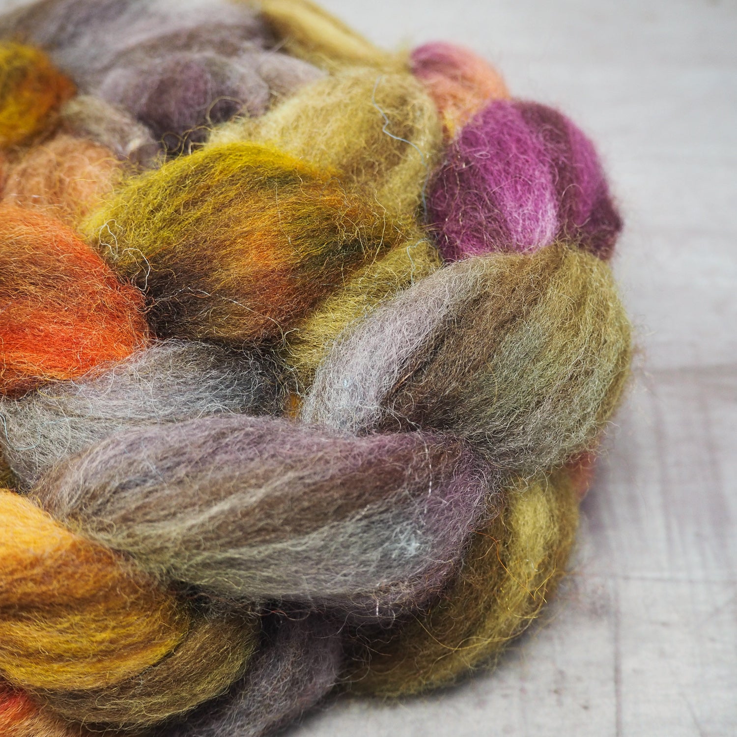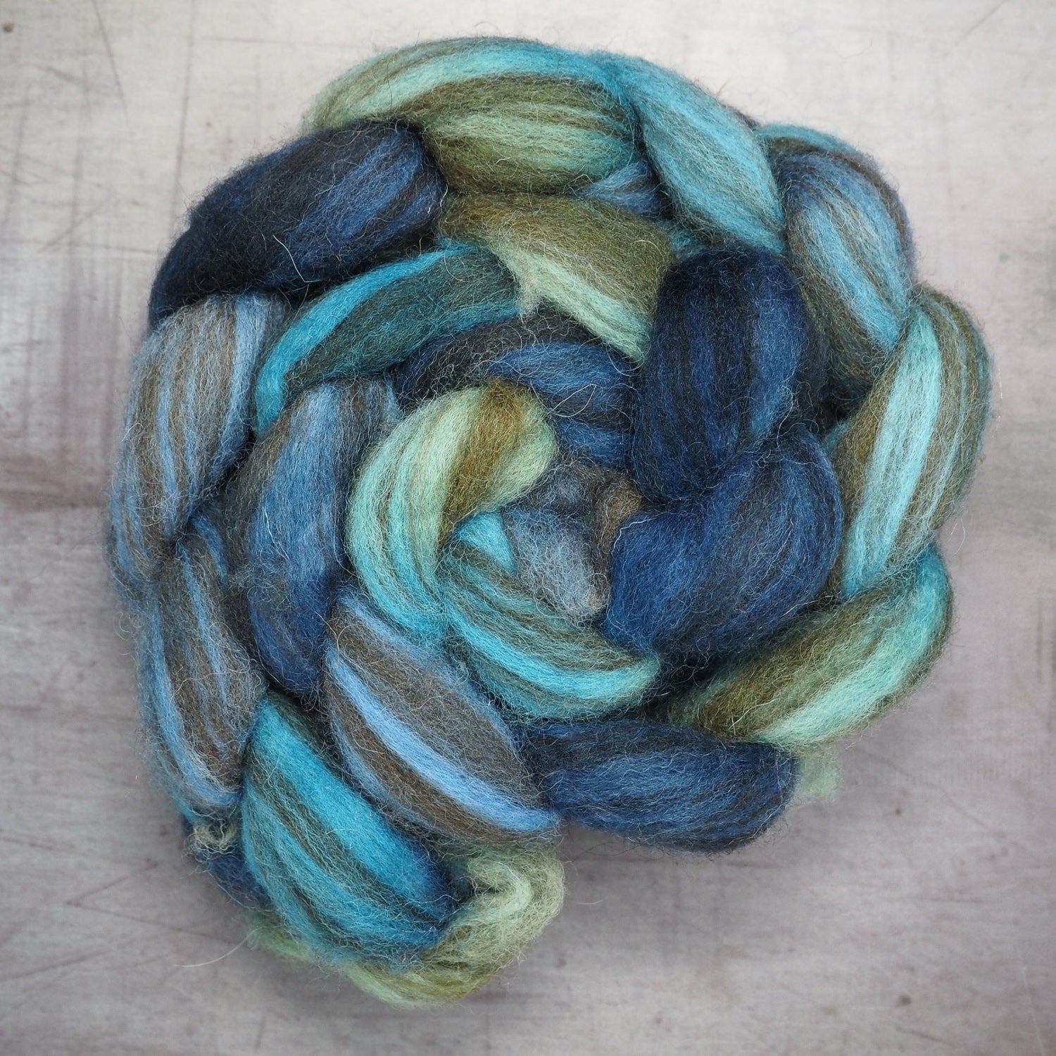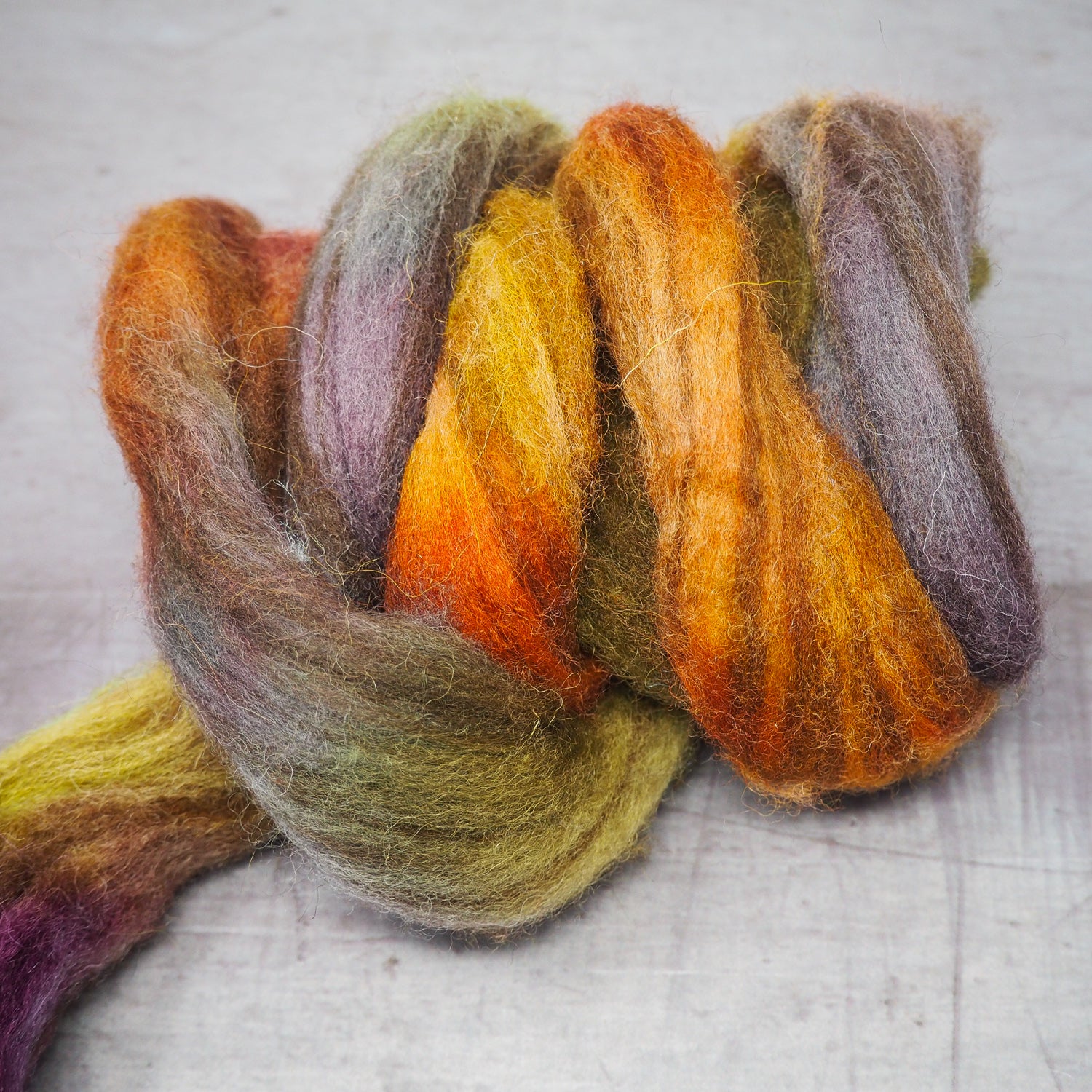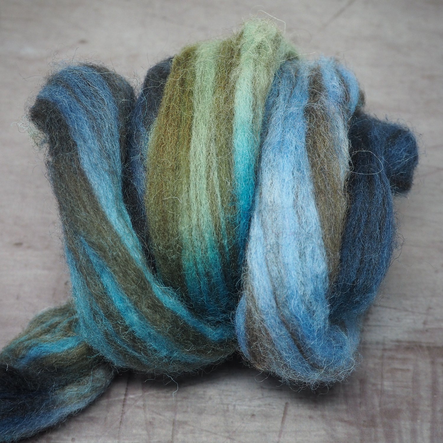 Spinning hand-dyed Shetland wool is a wonderful experience. This combed top is a humbug blend of different coloured wools, including white, grey, moorit (soft red-brown) and dark brown, giving it fantastic depth of colour.