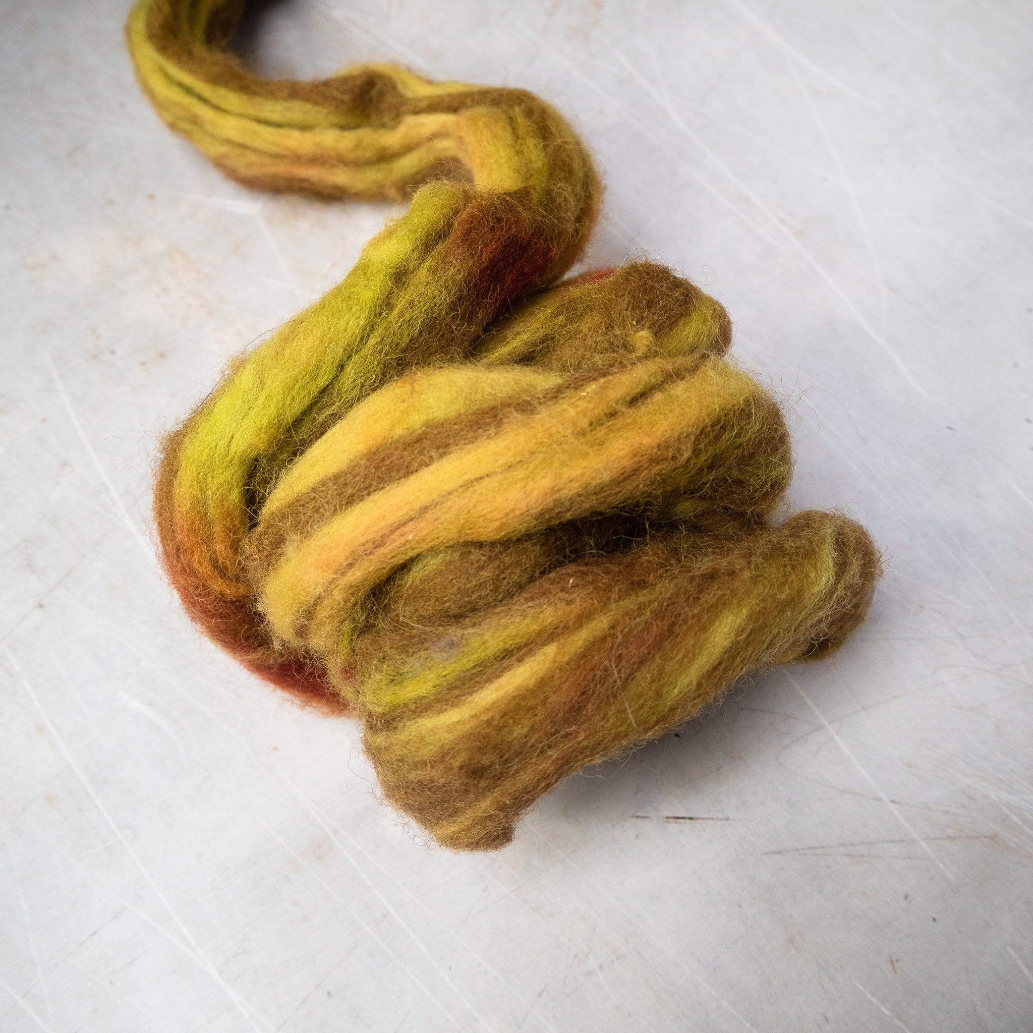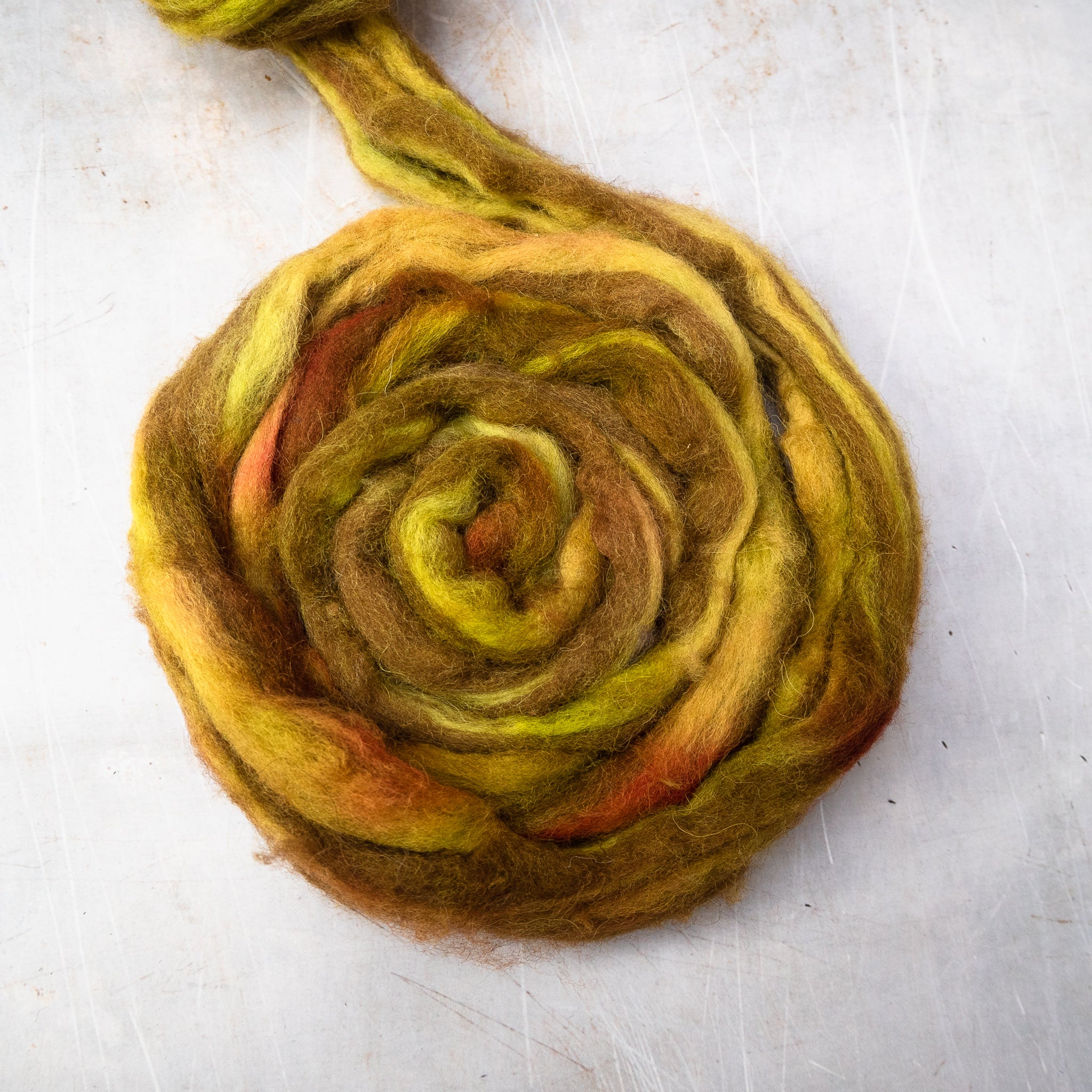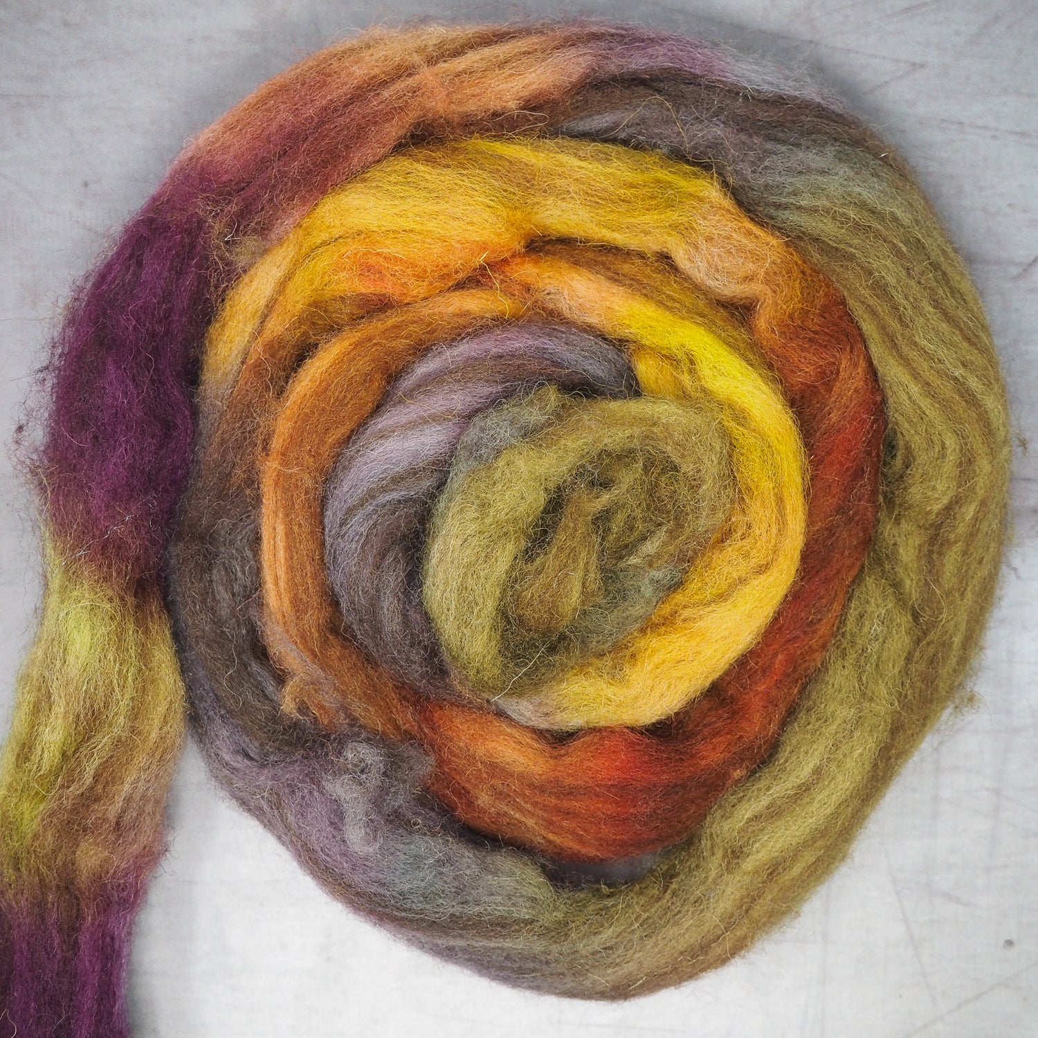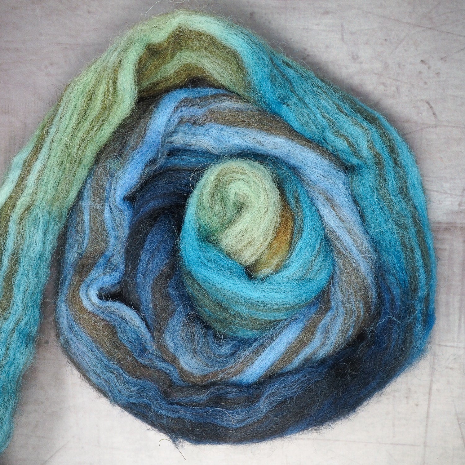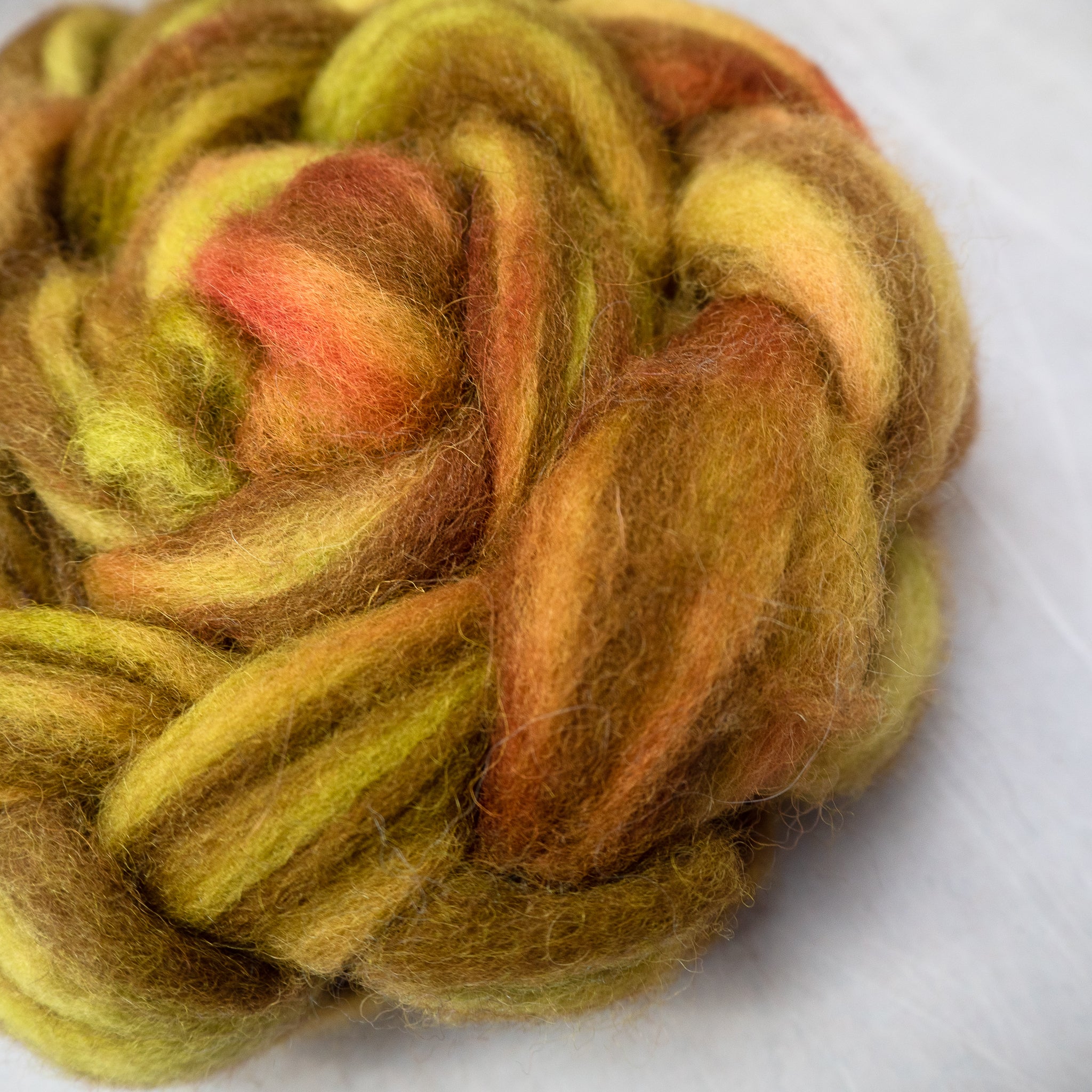 Spinning hand-dyed Shetland wool is a wonderful experience. This combed top is a humbug blend of different coloured wools, including white, grey, moorit (soft red-brown) and dark brown, giving it fantastic depth of colour.