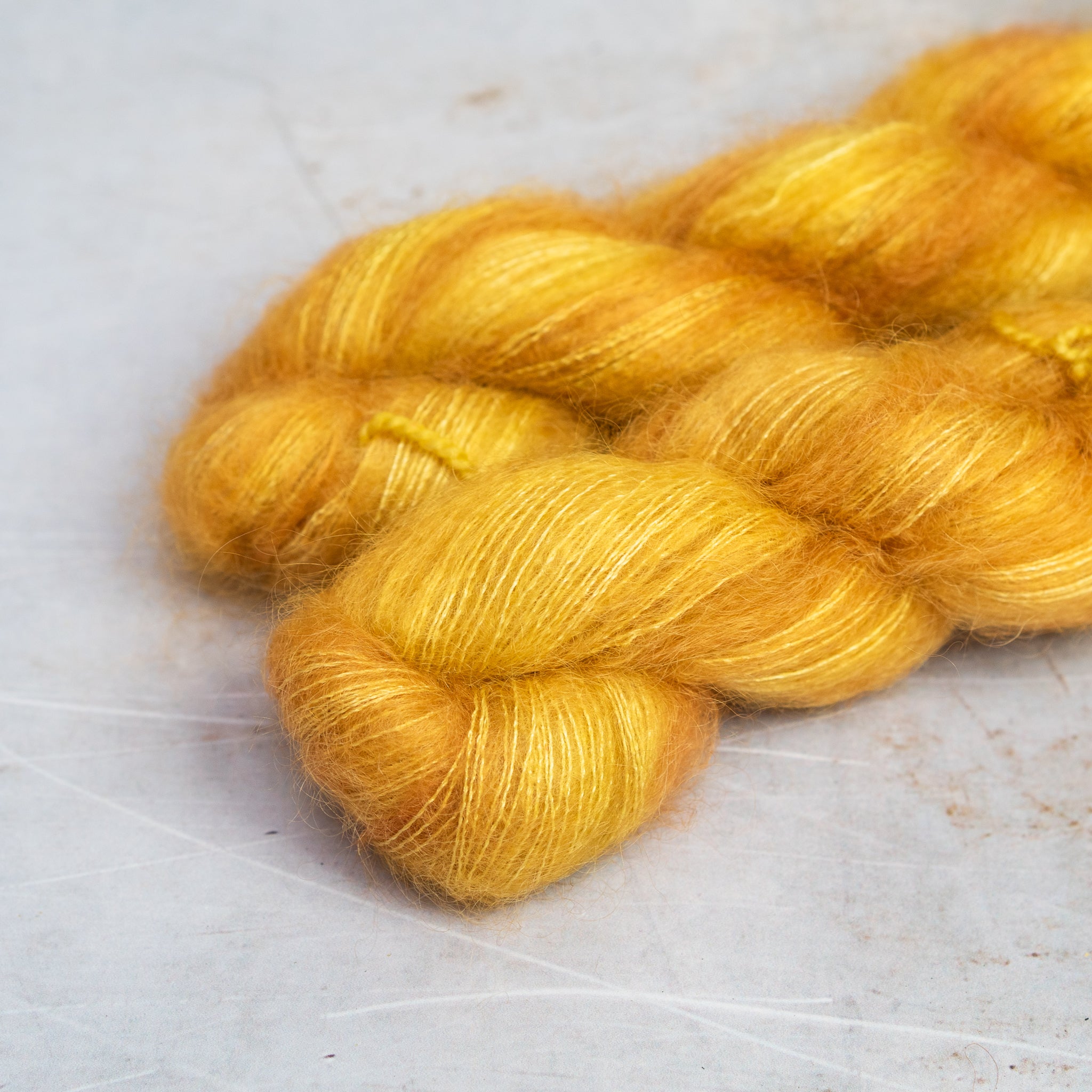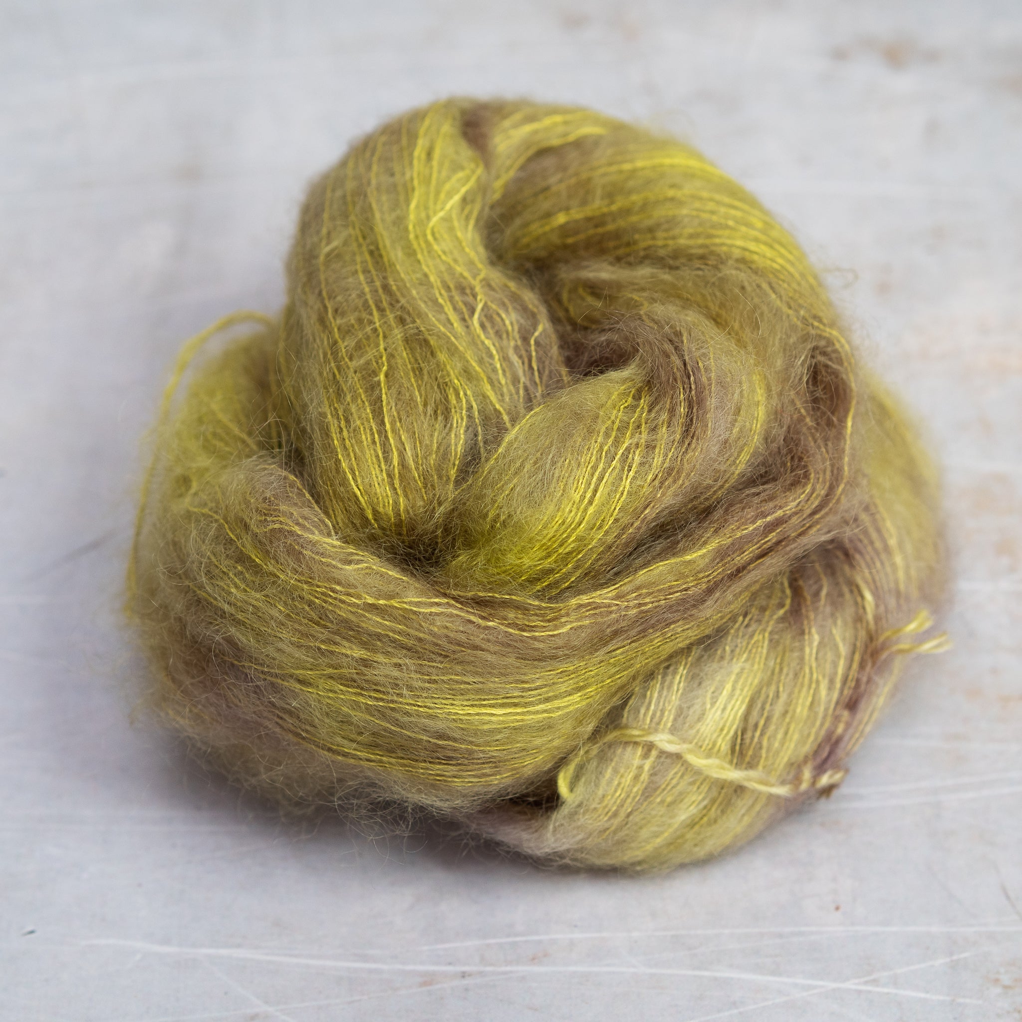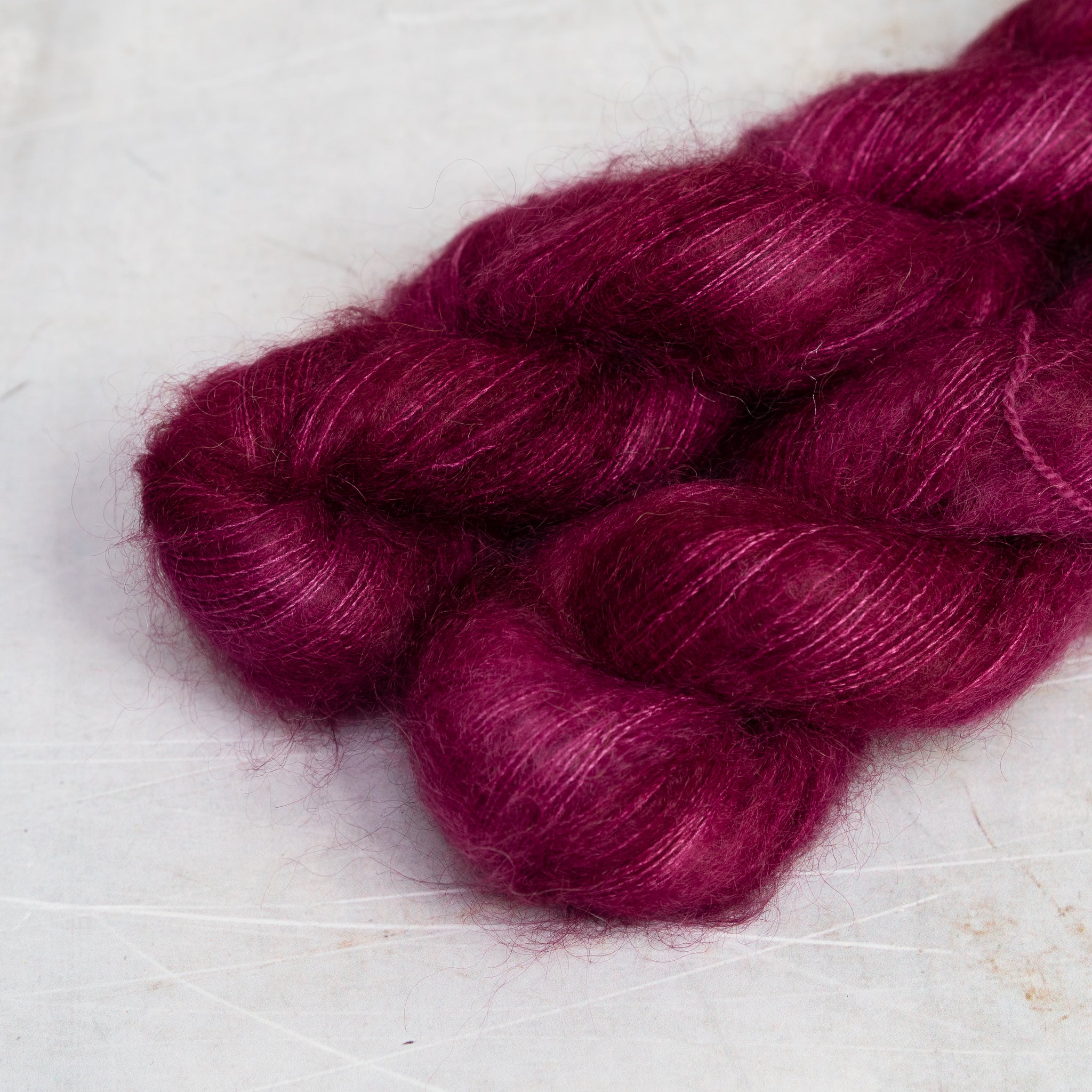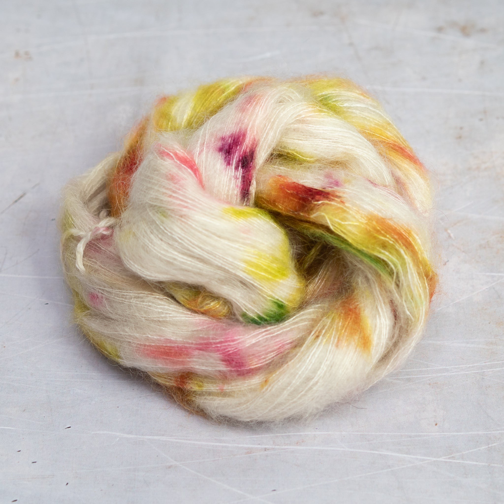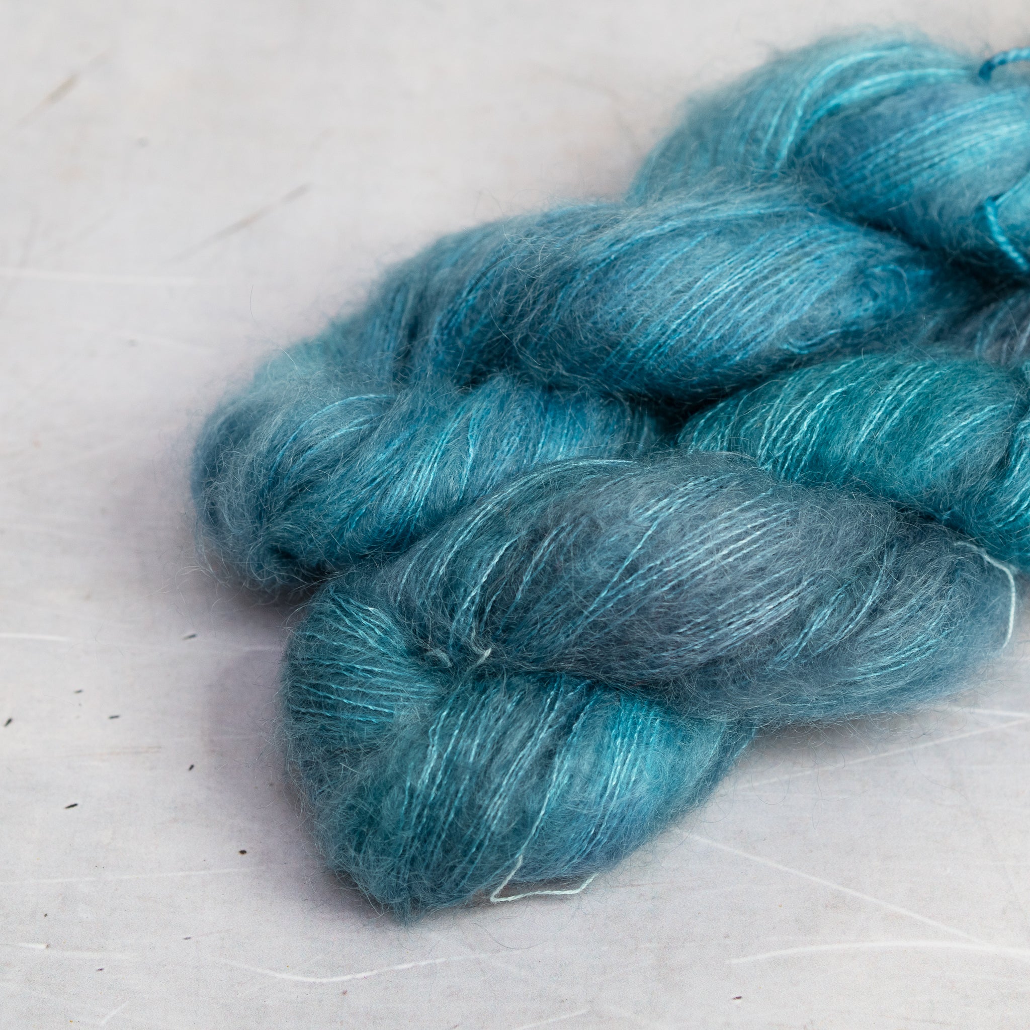 Willo-the-Wisp lace is a glorious confection of silk and kid mohair, with a distinctive halo. It's strong, shiny, and fluffy, and it plays really well with other yarns. It also takes colour like almost nothing else - intense and rich, with the yarn taking one shade and the mohair absorbing others. It's endlessly delightful to work with. Take it for a spin!